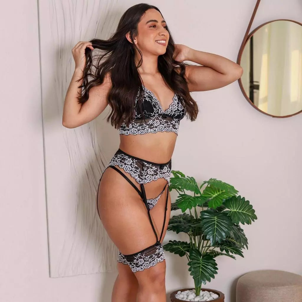 Projetado para quem ama provocar sem perder a classe, ele une renda luxuosa, design fio dental ousado e cinta-liga ajustável, criando um visual impactante e inesquecível.